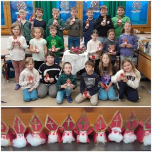 Jubel ertönte am Morgen des 5. Dezembers, als die Mädchen und Buben ihre Klassen betraten! Der Nikolaus war da! Die gebastelten Stiefel, Nikoläuse oder Säckchen waren tatsächlich gefüllt! Groß waren die Überraschung und Freude über Schokolade und Hausübungsgutscheine!