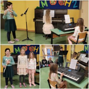 In der 3a hatten drei Mädchen ein kleines Weihnachtskonzert vorbereitet. Auf dem Klavier, dem Keyboard und der Querflöte spielten sie gemeinsam Weihnachtslieder. Die Mitschüler freuten sich über die gelungene Einstimmung auf das kommende Fest!